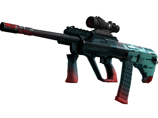 Powerful and accurate, the AUG scoped assault rifle compensates for its long reload times with low spread and a high rate of fire. It has been custom painted with bright colors and forward facing arrows.